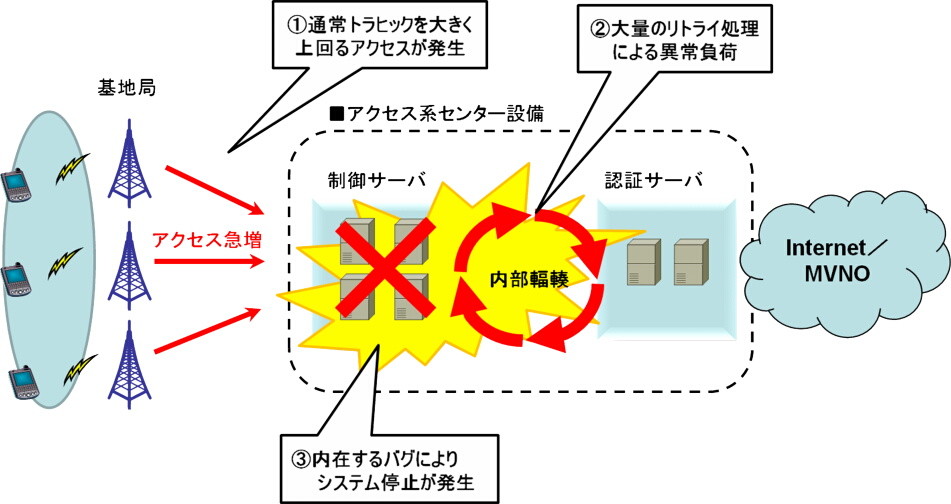 同社が公表した内容によると、通常トラフィックを上回るアクセスが集中し、アクセス系センター設備の内在するバグによりシステムが停止。制御下にある東日本全域の基地局が停波したという。負荷を制御しつつ復旧措置を行ったため、全面復旧までに時間を要した。