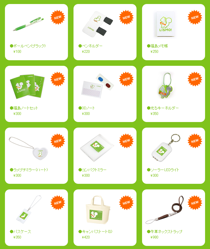 12種類の新商品がラインナップされたLISMOオリジナルグッズ 今回新たにラインナップに加わったのは、「ボールペン(ブラック)」「ペンホルダー」「福島メモ帳」「福島ノートセット」「3Dノート」「光るキーホルダー」「ラメプチミラー(ハート)」「コンパクトミラー」「ソーラーLEDライト」「パスケース」「キャンパストート(S)」「牛革ネックストラップ」の12種類。