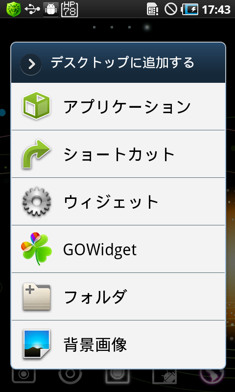 まずはホーム画面の何も無い所で長タップしてメニューを表示させます。
