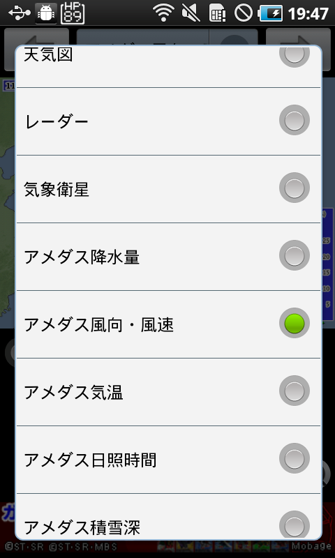 表示できる画像は画面上部から、天気図、レーダー、気象衛星、アメダス降水量、アメダス風向・風速、アメダス気温、アメダス日照時間、アメダス積雪深と選べますので必要な物を選んでくださいね。