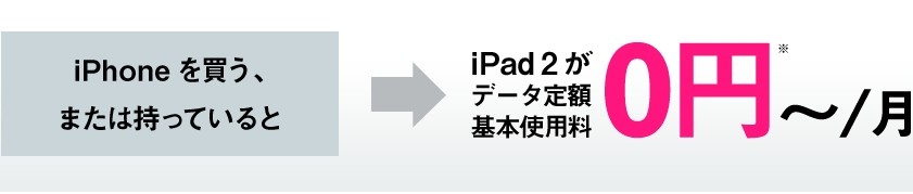 このキャンペーンは、12月1日から2012年1月31日までの間にiPhoneを契約中またはiPhoneを契約するユーザーが同一名義及び同一請求先でiPad2を契約すると、利用料金を100MBまで0円、ユニバーサルサービス料を0円にするというもの。