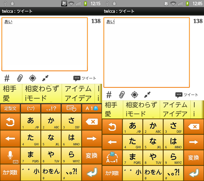 左の画面がARROWS X LTE F-05Dにプリインストールされている「NX!input」、右の画面がジャストシステムが販売している「ATOK」をARROWS X LTE F-05Dで使ったところです。どちらも画面のデザインはよく似ていますが(キーの色はどちらも「紅花」に設定)、若干の違いも見受けられます。デフォルト設定でのキーの大きさが「NX!input」の方が若干大きく、文字キー部分と予測変換候補の間に細長い各種キーが入っているのが特徴です。「ATOK」とはキー配列が異なるので、既に「ATOK」に慣れた人は注意が必要です。