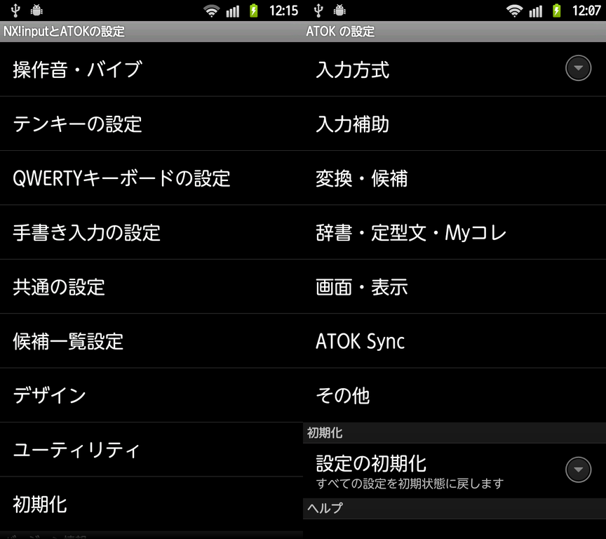 左が「NX!input」の設定画面で、右が「ATOK」の設定画面です。一つ大きな違いは「ATOK Sync」の有無。「ATOK Sync」はパソコンやタブレットで使っている「ATOK」の辞書とインターネット経由で辞書を同期できる機能です。この機能が「NX!input」にはないのです。「NX!input」でパソコンの「ATOK」辞書を使うには、パソコンの「ATOK」で辞書ファイルをエクスポートしてこのファイルをARROWS X LTE F-05DのメモリもしくはmicroSDカードに移し、このファイルをインポートすればパソコンの「ATOK」辞書を使うことは可能です。ただ、クラウドで同期してくれた方が遥かに楽です。「ATOK Sync」はジャストシステムが有料で販売している「ATOK」独自の機能としておきたかったのかもしれませんね。