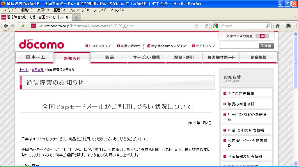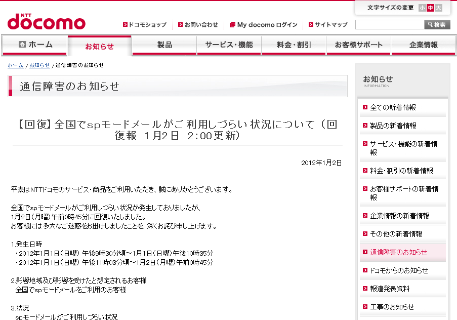 その後、NTTドコモでは、2012年1月2日(月)0:45に上記のspモードが接続しづらい状況が回復したことを発表しています。