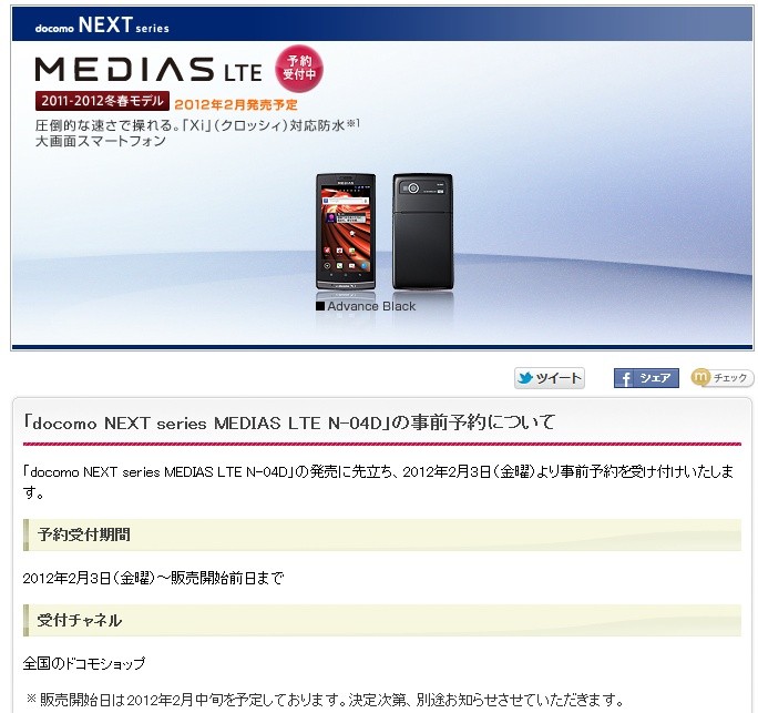 MEDIAS LTE N-04Dは、先日2月3日(金)から事前予約を開始しており、当初は製品ページにて2月10日(金)に発売予定であることが告知されていましたが、同じ製品ページにて2月中旬に変更されています。