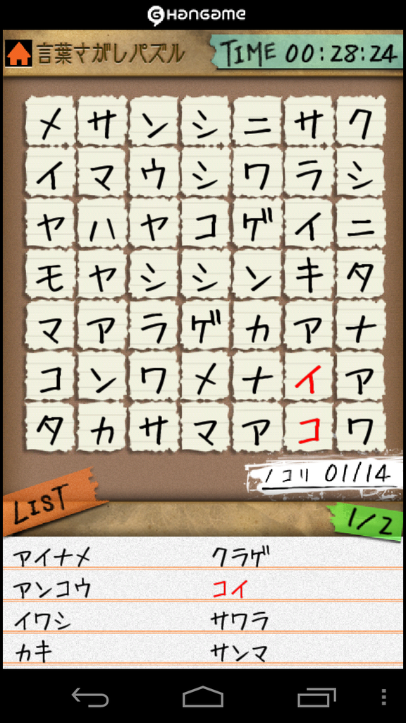画面の下のリストに有る単語をマスの文字の中から探します。