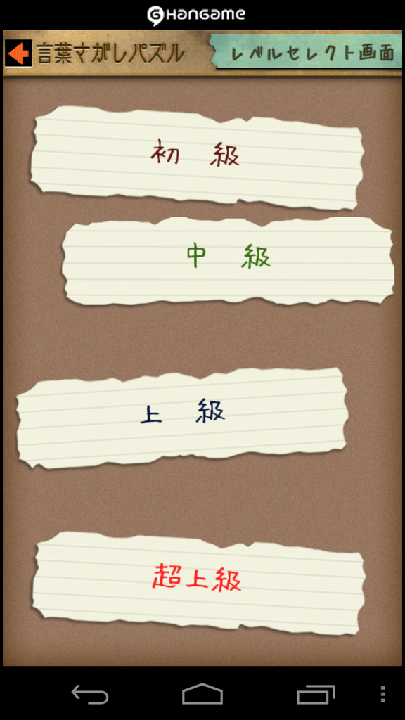 [Tap to Start]からゲームを始めると、初級・中級・上級・超上級の4つのレベルから選んで遊ぶことができます。