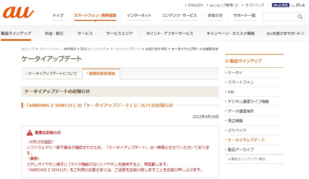 KDDIおよび沖縄セルラーは23日、モバイルWiMAXに対応し、防水やおサイフケータイ、ワンセグ、赤外線機能といった国内において需要の高い機能を搭載したAndroidスマートフォン「ARROWS Z ISW11F」(富士通東芝モバイルコミュニケーションズ製)において先日19日に配信開始したケータイアップデートを適用後にステレオイヤホン端子に (マイク機能のない) イヤホンを接続すると再起動する不具合が見つかったとして該当するケータイアップデートを一時停止したことをお知らせしています。