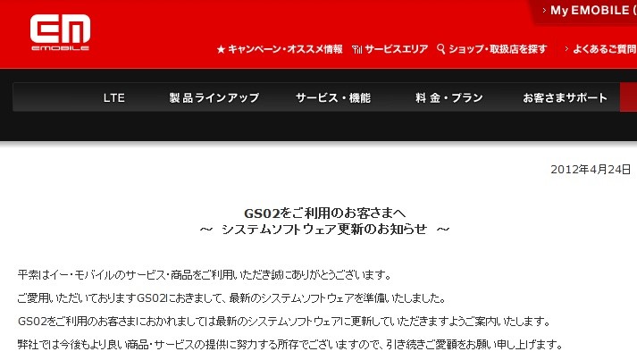 ・【GS02】 システムソフトウェアダウンロード - スマートフォン・携帯電話 | イー・モバイル
