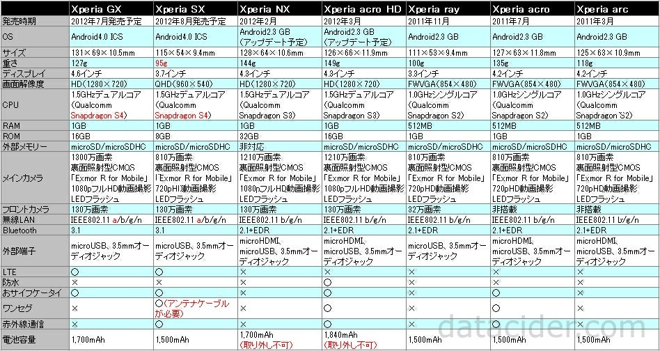 先行してソニーモバイルコミュニケーションズから日本市場向けに投入されると発表されていた「Xperia GX」と「Xperia SX」。詳細なスペックが公開されていない中、わかる範囲で過去の「Xperiaシリーズ」との比較を以前に行いました。