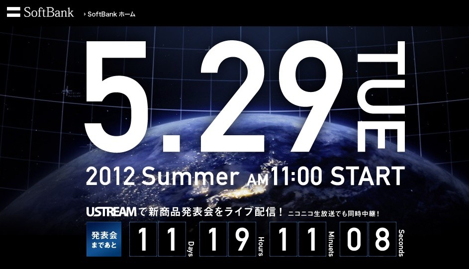 ソフトバンクモバイルとウィルコムは17日、2012年5月29日(火)午前11時から「2012年夏 新商品発表会」を開催することを公式ティザーサイト「ソフトバンクモバイル新商品発表会 2012 Summer | ソフトバンクモバイル」にて告知しています。