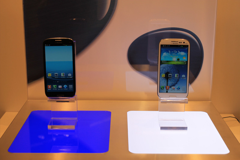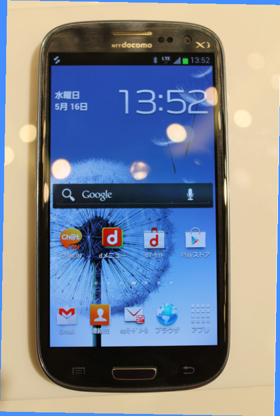 GALAXY SⅢ(SC-06D)。本体色はペブルブルー(ペブルとは滑らかな丸石のこと)とマーブルホワイトの2色。