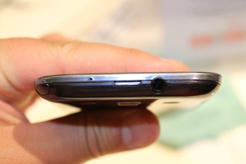 天面側にはワンセグ用アンテナに動画撮影などに使うマイク、イヤフォンジャックがあります。また、裏蓋を外す時にツメをひっかける窪みもあります。