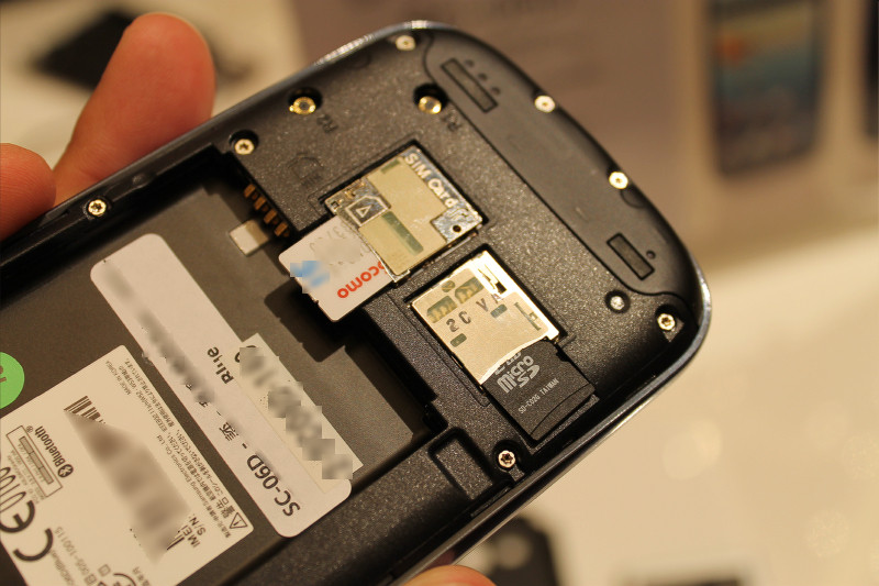 裏蓋を外すとミニUIMカードスロットとmicroSDXC64GBにまで対応したmicroSDカードスロットがあります。