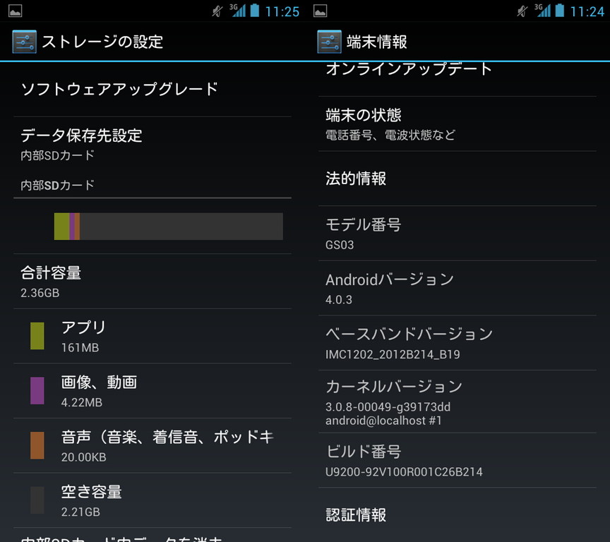 内部ストレージの空き容量は約2.2GB(左)。Androidのバージョンは4.0.3(右)
