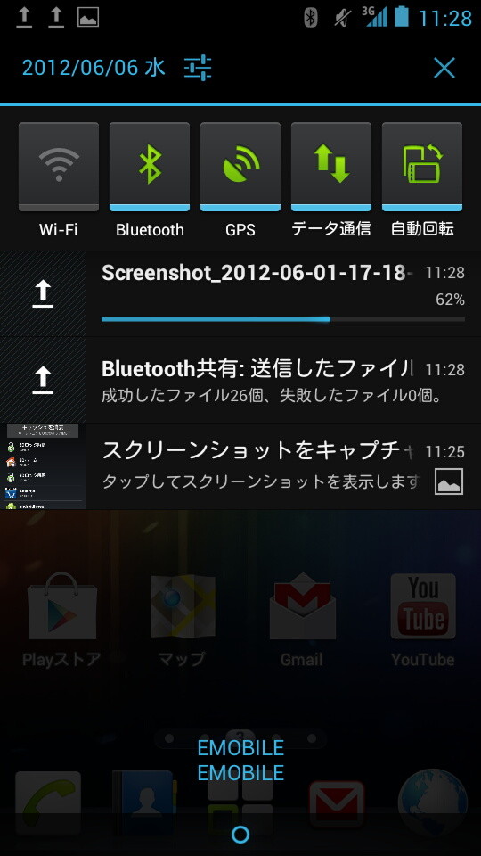 画面上部のステータスバーを引き下げた際のメニュー表示には、「Wi-Fi」「Bluetooth」「GPS」「データ通信」「自動回転」がワンタップでON/OFF切替できるようになっている。
