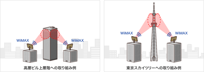 東京スカイツリーは自立式電波塔として世界一の高さを目指し、地上から高さ634(むさし)mを誇る超高層建造物。WiMAXのエリア整備の対象は、地上350mの「東京スカイツリー天望デッキ」と地上450mの「東京スカイツリー天望回廊」。