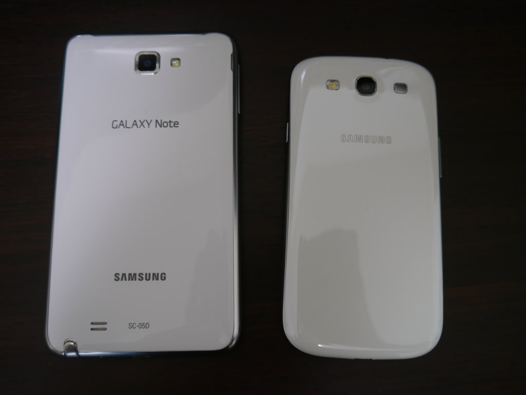 GALAXY SIIIはGALAXY Noteよりも小さいものの、iPhone 4Sより大きいということがわかります。これらの3台を並べると、iPhone 4Sがものすごくコンパクトにみえます。