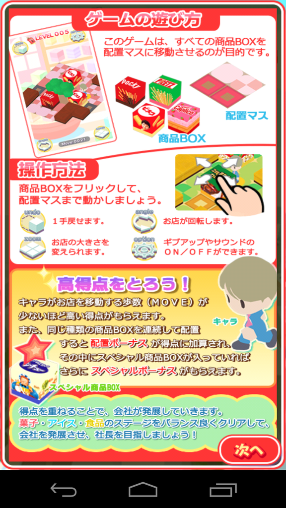 ゲームの詳しい遊び方は画面で確認していただくとして、基本的には商品を移動させて並べるというのがルールです。