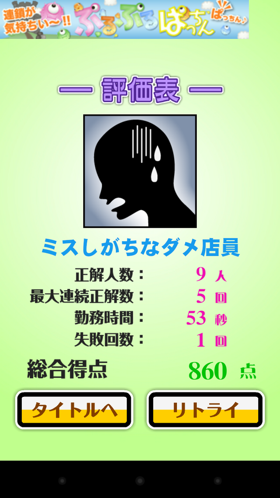 ゲームが終われば評価が表示されます。