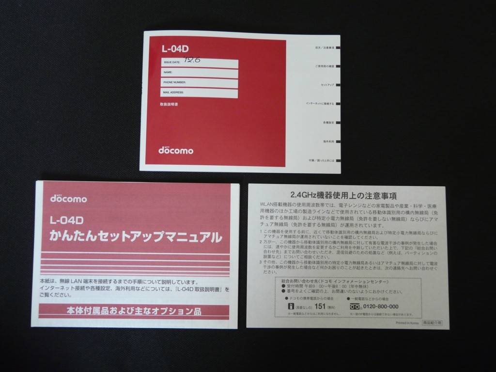 L-04Dセットの同梱品は本体、電池パック L17、専用ケース(試供品)、取扱説明書(接続ガイド)と、かなりシンプルです。ここで注意しないといけないのは、ACアダプタやマイクロUSBケーブルが添付されない点です。最近のスマートフォンを持っていれば、同梱品にマイクロUSBケーブルなどが付いているでしょうから、添付されないことが直ちに問題となることは少ないと思われます。もしも、別途充電用ACアダプターやマイクロUSBケーブルが必要な場合は、ドコモがスマートフォン向けに販売しているものや、サードパーティー製のものを購入して使うことになります。対応オプション品には、ドコモ純正の「ポケットチャージャー01」や「ポケットチャージャー02」も含まれています。 筆者の利用方法では、ポケットチャージャーの類はなくても十分でしたが、特にLTEエリア内でとてつもなくヘビーに通信される方は、併用を検討してみてもいいかもしれません。