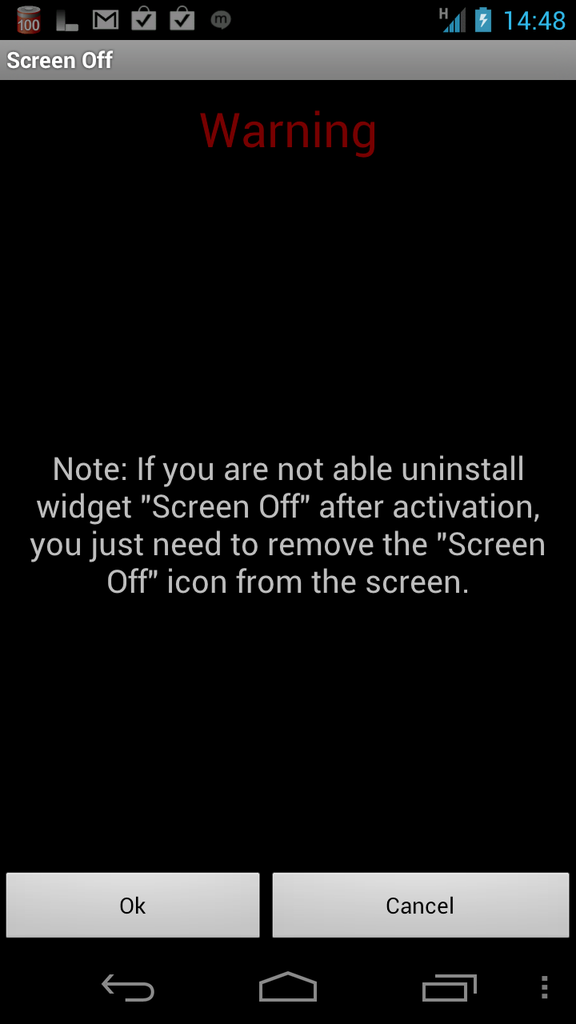 ホーム画面の長押しで「Screen Off」のウイジェットを配置します。Warning表示になりますが、「OK」をタップします。