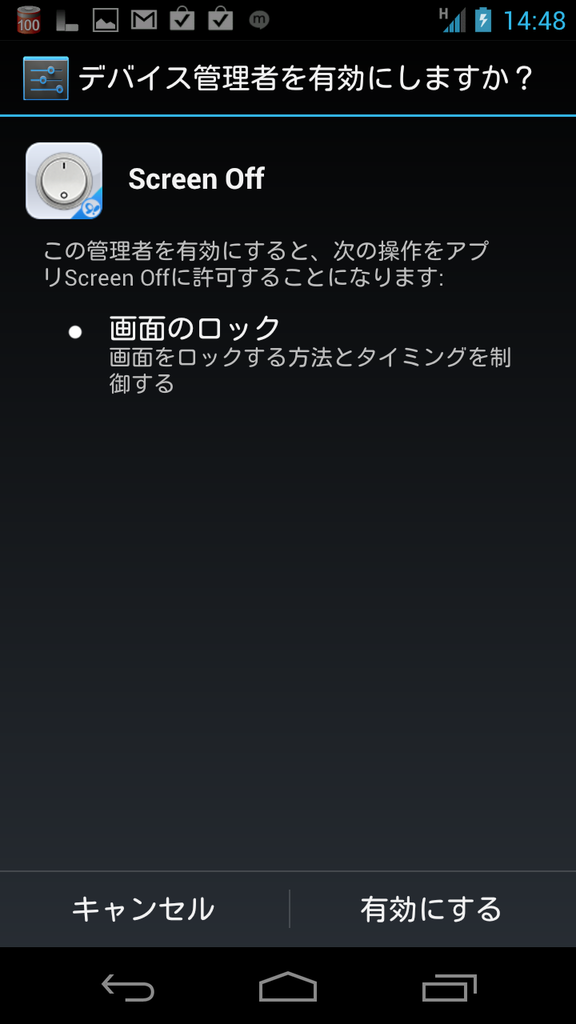 ホーム画面に「Screen Off」のウィジェットが配置されるので、配置されたアイコンをタップすると「デバイス管理者を有効にしますか?」の画面が表示されたら「有効にする」をタップします。