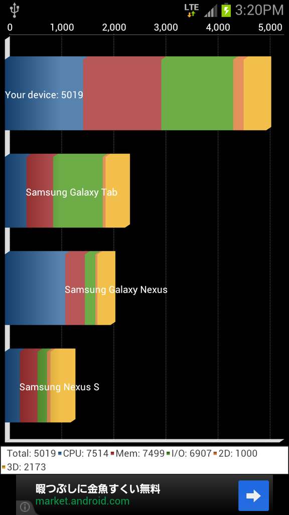 しかしながら、細かい項目ごとの数値を見てみると、ドコモ板SC-06DではCPUの結果が7,500前後であるのに対し、グローバル版GT-I9300ではCPUの結果が1万2,500前後と1.5倍以上となっています。逆に、グローバル版はRAMが1GBであり、ベンチマークのMemの結果がドコモ板のほうが優れているということになっています。