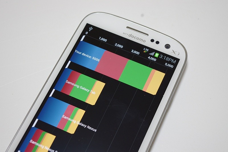 一方で、GALAXY SIIIの海外モデルはサムスン電子が独自に32nmで製造するARM Cortex-A9ベースの1,4GHz駆動のクアッドコアCPU搭載「Exynos 4412」を採用しており、海外版との違いも気になるところです。すでに当ブログメディア「S-MAX(エスマックス)」では海外モデル(型番:GT-I9300)のベンチマークも行なっており、Quadrantではトータルで5218となっていました。