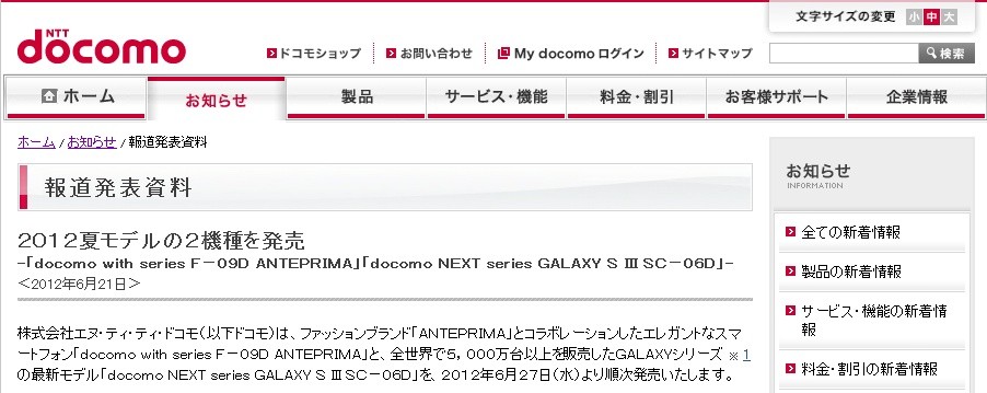 ・報道発表資料 : 2012夏モデルの2機種を発売 | お知らせ | NTTドコモ