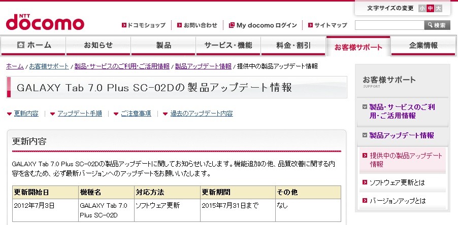 ・GALAXY Tab 7.0 Plus SC-02Dの製品アップデート情報 | お客様サポート | NTTドコモ