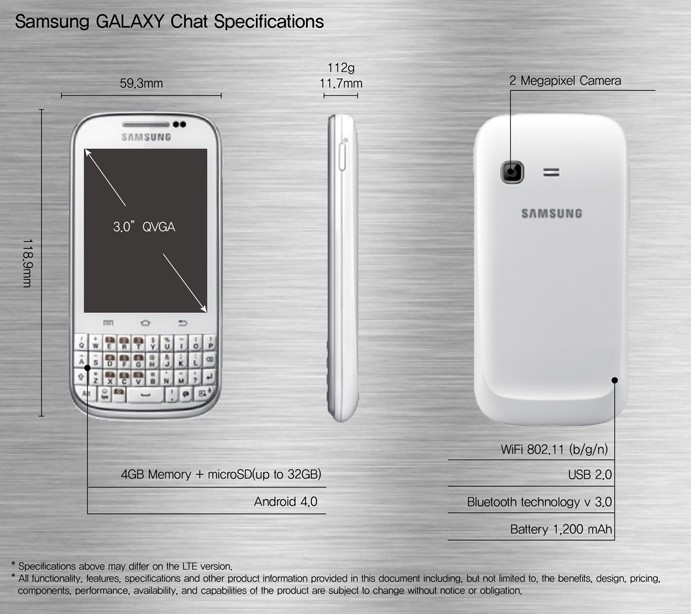 Samsung Electronics(サムスン電子)は4日(現地時間)、同社のスマートフォン「GALAXYシリーズ」における新機種「GALAXY Chat(型番:GT-B5330)」を発表しています。前面QWERTYキーボードを搭載し、Android 4.0(開発コード名:IceCream Sandwich;ICS)を採用したモデルです。
