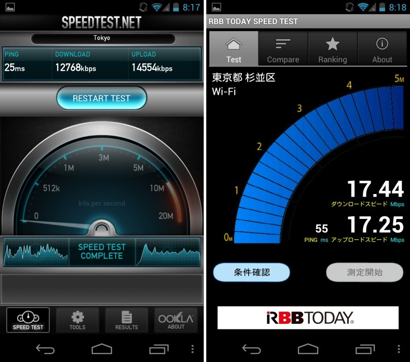 通信速度も「speedtest.net」と「RBB TODAY SPEED TEST」というアプリでそれぞれ試してみましたが、下りも上りも10~20Mbps程度出ていて、バックボーンもきちんと光回線となっているようで、非常に快適に利用できていました。
