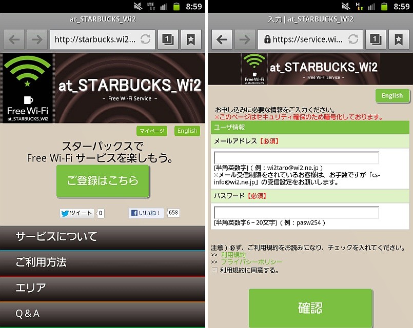 at_STARBUCKS_Wi2の公式ページで「ご登録はこちら」をタップし、メールアドレスとパスワードを入力して、「利用規約に同意する」にチェックしてから「確認」をタップします。