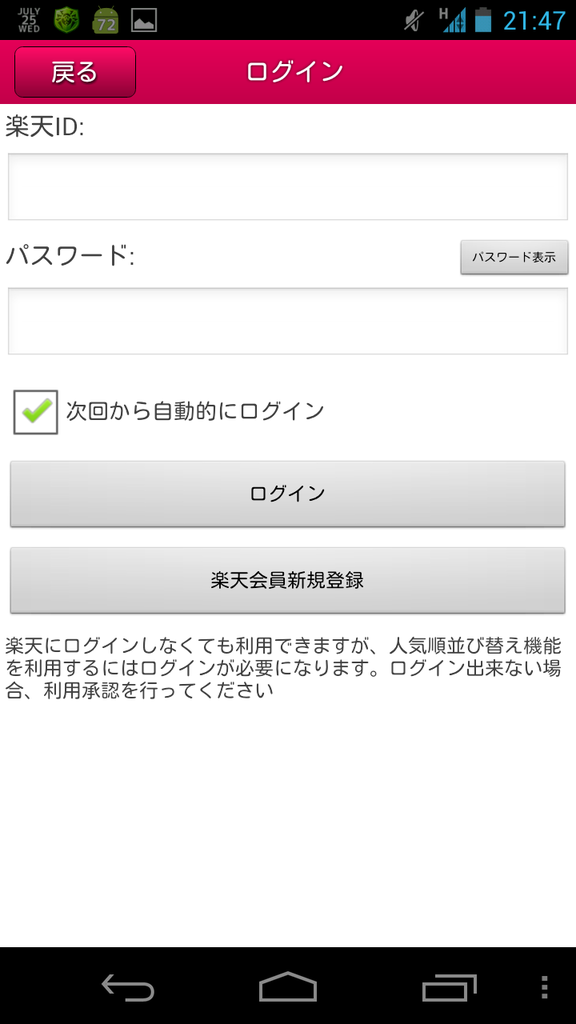 楽天会員でログインするには、端末メニューキーから[ログイン]をタップし、IDとパスワードを入力します。