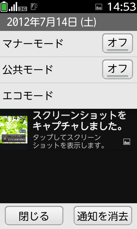 うまくいくとカシャッと音がなり、はじめの写真のような画面が表示され、通知エリアに「スクリーンショットを保存中...」と表示されます。その後、ステータスバーを表示すると「スクリーンショットをキャプチャしました。タップしてスクリーンショットを表示します。」と表示されているので、タップすると画面キャプチャした画像が表示されます。