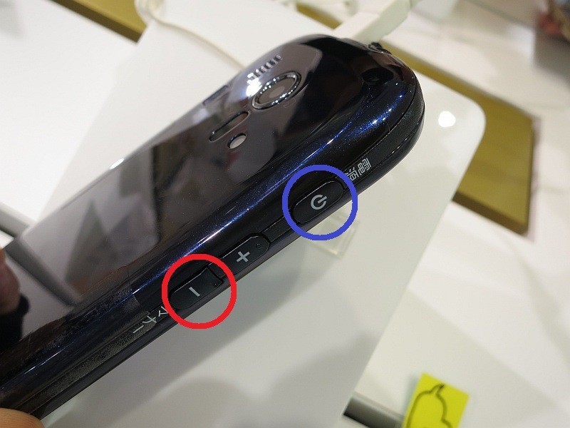 下写真のように電源キー(青丸)および音量下キー(赤丸)は本体左側面に配置されています。キー同士が比較的近くにあるので、ちょっと押しづらいかもしれません。