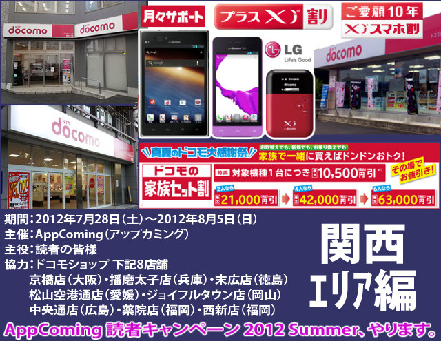 ・AppComing、ドコモショップで端末をお得に購入できる「AppComing読者キャンペーン 2012 Summer」を7月28日から開催!関西・中国・四国・九州の8店舗で実施 - S-MAX - ライブドアブログ