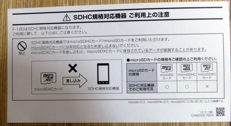 SDHC規格対応機器ご利用上の注意。らくらくスマートフォン F-12DはSDHC規格のmicroSDHCカードに対応しています。SDXCカードには非対応なので、使用しないように注意する旨が記載されています。