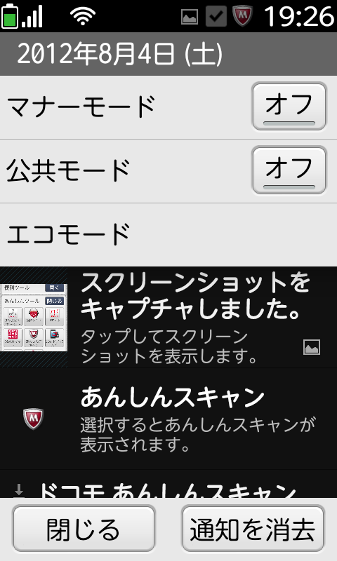 マナーモード、公共モード、エコモードはここから簡単に切替可能です。