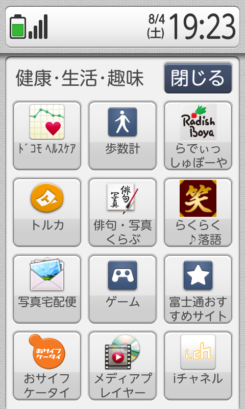歩数計、健康管理に役立つアプリや、俳句、落語などのシニア向けコンテンツがインストールされています。