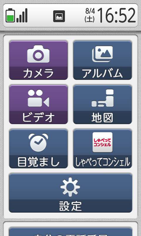 さらに下に進みますと、カメラ、アルバム、ビデオ、地図、めざまし、しゃべってコンシェルといった生活ツールが揃っています。