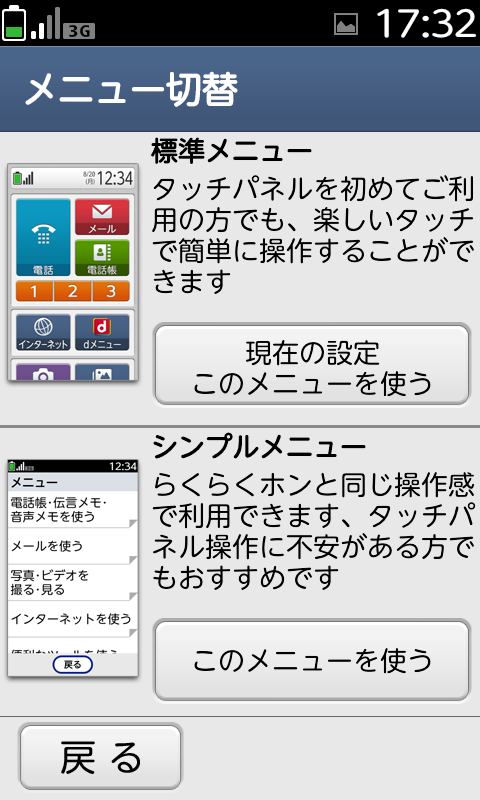 らくらくスマートフォン F-12Dは、2種類のメニューから選択することができます。
