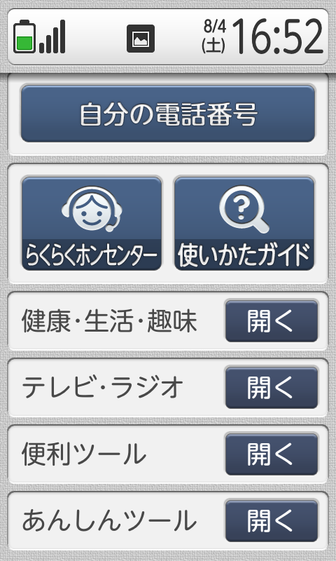 「らくらくホンセンター」から専用のコールセンターに電話をかけることができます。「使いかたガイド」は、端末の操作で分からないことがあるときに調べるのに便利なアプリです。