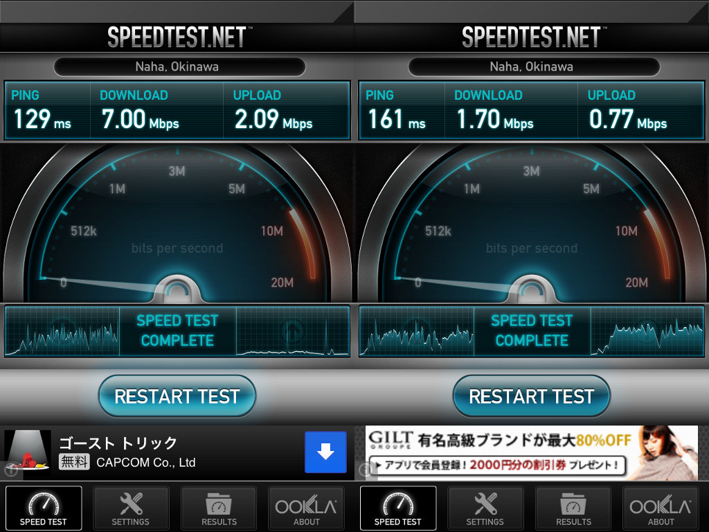 iPadとDATA08Wの接続方式はWPA2、DATA08Wの設定はすべて初期設定とします。iPadで速度測定を行う際は「Speedtest.net Mobile speed test」アプリを使用し、速度測定サーバーは比較的安定した測定ができる「Naha, Okinawa」を選択しています。なおDATA08Wの特徴として、使用する回線を「WiMAX」「3G」「WiMAX+3G」から選択できますが、今回は回線切替についても検証するため常に「WiMAX+3G」を選択しています。