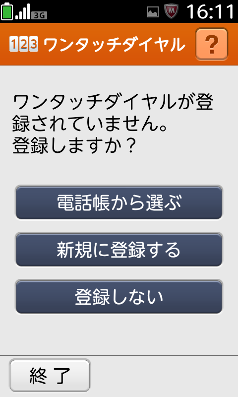 ワンタッチダイヤルは3つまで登録することができます。登録されていない状態でワンタッチダイヤルの123の各番号ボタンをタッチすると、登録のガイダンスが表示されます。電話帳から設定する場合、電話番号とメールアドレスをそれぞれ1つ選択するようになっています。