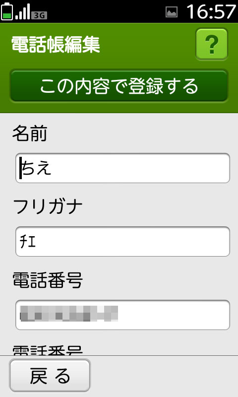 「名前」→「フリガナ」→「電話番号」→「メールアドレス」を一つずつ登録したら一覧画面に移行します。さらにここから追加の電話番号、メールアドレス、グループ、着信音、住所、メモ、誕生日を登録することができます。登録する情報を全て入力したら「この内容で登録する」をタップすると登録が完了します。
