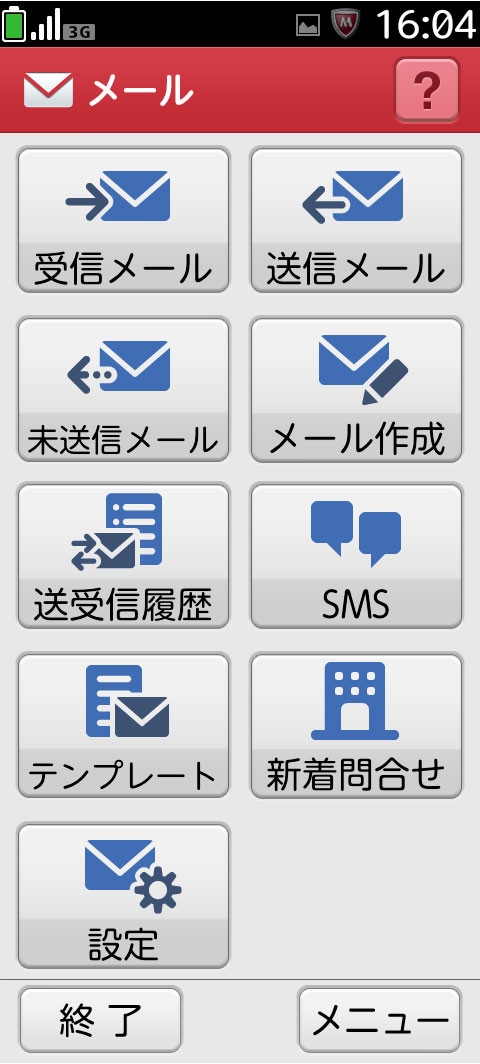 メールアプリのメニュー画面は、全てアイコンと文字による分かりやすい表示を採用しています。アイコンも大きなサイズなので、大きめで押しやすいボタンのようになっています。