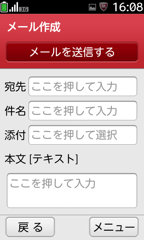 メール作成画面は、「宛先」「件名」「添付」「本文」のそれぞれを入力していきます。デザインもシンプルで表示されている文字も大きくて分かりやすいです。