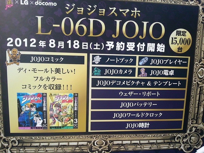 昨日18日(土)からドコモショップなどで事前予約が開始された今夏のNTTドコモ「2012年夏モデル」のうちで人気マンガ「ジョジョの奇妙な冒険」の連載25周年を記念した限定モデルで通称“ジョジョスマホ”とも言われる「JOJO L-06D」(LGエレクトロニクス製)。